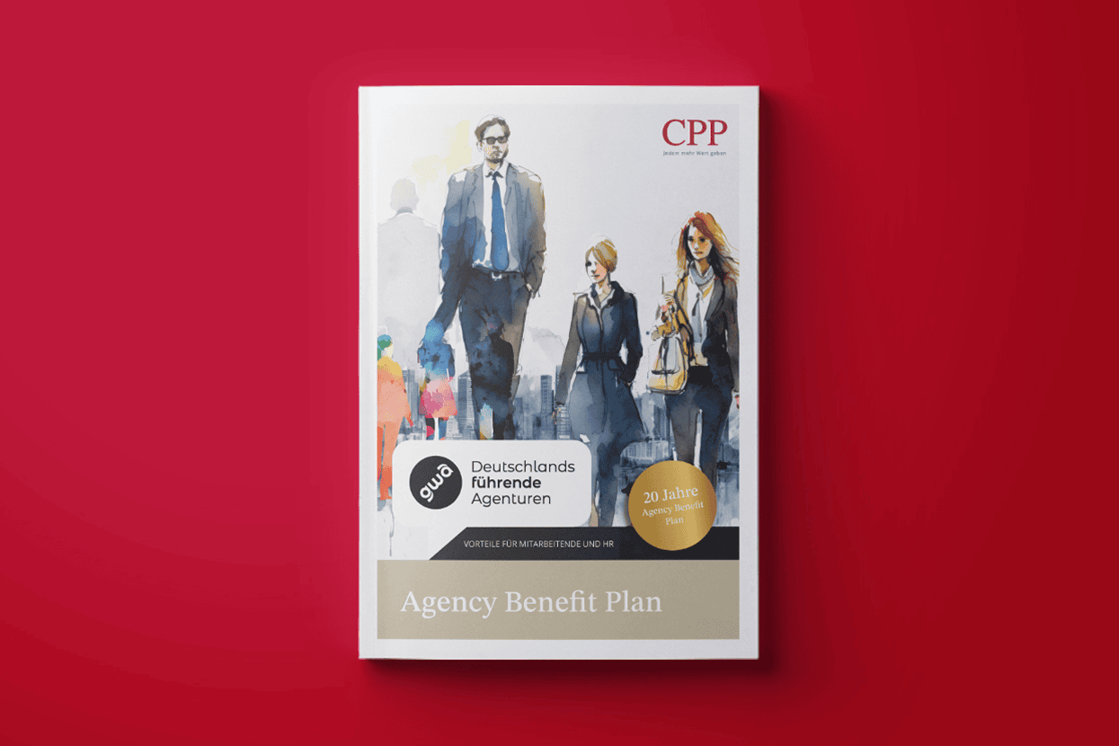 Agenturbranche Betriebliche Vorsorge für kreative Teams Der GWA Agency Benefit Plan macht betriebliche Vorsorge für Agenturen einfach: geprüfte Lösungen, GWA-Sonderkonditionen und Full-Service durch CPP. Damit Sie Talente gewinnen, binden und Ihre HR-Abteilung entlasten. Jetzt beraten lassen Viele Tools, wenig Zeit – Vorsorge bleibt liegen Junge Teams, hohe Fluktuation, knappe Ressourcen. In der Dynamik des Agenturalltags wird finanzielle Vorsorge oft vertagt, obwohl sie für Mitarbeitende wichtig ist. Es fehlt Orientierung, Kommunikation und eine Beratungslösung, die sich in Pitches, Produktionen und Projektgeschäft reibungslos einfügt. Vorsorge, die zur Agenturwelt passt Der GWA Agency Benefit Plan schafft Orientierung. Financial Education Formate, digitale Beratung und übertragbare Verträge sorgen dafür, dass Vorsorge einfach und flexibel bleibt, passend zum Lebensstil der Branche und zu wechselnden Lebensphasen. Betriebliche Altersvorsorge (bAV) Bieten Sie geförderte bAV mit GWA-Sonderkonditionen, flexiblen Beiträgen, nachhaltiger Anlage und Life-Time-Conditions – auch bei Arbeitgeberwechsel. Berufsunfähigkeitsabsicherung (BU) Sichern Sie Ihr Team finanziell gegen Berufsunfähigkeitsrisiken ab: bis zu 50 % günstiger als privat, ohne Gesundheitsfragen, inkl. Expertenservice im Leistungsfall. Betriebliches Gesundheitsbudget Stellen Sie Ihren Mitarbeitenden ein Gesundheitsbudget bereit: schnelle Kostenerstattung per Mitarbeiter-App & Facharztterminservice und das ohne Mehraufwand für HR. Zeitwertkonten (LAZ/ATZ) Ermöglichen Sie Sabbaticals, längere Elternzeit oder früheren Ruhestand: Zeit oder Geld flexibel zu GWA-Konditionen ansparen. BU: Bewährt im Agenturalltag Agenturrealität heißt Tempo, Projektarbeit und Fluktuation. Unser Ziel ist, Mitarbeitenden eine Lösung bereitzustellen, die verlässlich funktioniert und spürbar Sicherheit gibt. Wie man kreative Teams aufmerksamkeitsstark ansprechen kann, zeigt unser Kunde Jung van Matt mit seiner BU-Kampagne. Sie sehen gerade einen Platzhalterinhalt für ein Vimeo-Video. Um das Video abzuspielen, klicken Sie auf den Button unten. Bitte beachten Sie, dass dabei Daten an Vimeo (Drittanbieter) übertragen werden. Mehr Informationen Inhalt entsperren Erforderlichen Service akzeptieren und Inhalte entsperren Kompakt erklärt: Der Agency Benefit Plan Profitieren Sie von mehr als 20 Jahren Agentur-Erfahrung. In unserer Broschüre lesen Sie, was Agenturen über den Agency Benefit Plan sagen. Gewinnn Sie außerdem einen schnellen Überblick über alle GWA-Vorteile und die wichtigsten Versorgungs-Bausteine. Jetzt herunterladen Zertifizierter Service – stark für Ihre Teams Wir gehen mit gutem Beispiel voran: Als Great Place to Work® zertifiziert stehen wir für glaubwürdige, faire Führung und die aktive Förderung unserer Mitarbeitenden. Dieses Verständnis prägt auch unsere Arbeit für Kunden. Mit TÜV-qualifiziertem Qualitätsmanagement, praxisnahen Konzepten und gelebter Service-Exzellenz verbinden wir Pflicht und Kür – für verlässliche Vorsorge und begeisternde Beratung Ihrer Teams. Ihre Fragen. Unsere Antworten. Was Agenturen jetzt wissen sollten Kann unsere Agentur auch dann mitmachen, wenn sie kein Mitglied im GWA ist? Ja. Der GWA Agency Benefit Plan ist ein Rahmenkonzept für alle Agenturen und nicht an eine Mitgliedschaft gebunden. Welche Vorteile hat der GWA Agency Benefit Plan für uns und unsere Mitarbeitenden? Alle Lösungen sind vorgeprüft und haben GWA-Sonderkonditionen, die sonst nicht verfügbar sind. Mehr dazu finden Sie in unserer Broschüre. Müssen wir immer den kompletten Plan nehmen oder können wir einzelne Lösungen auswählen? Sie können alles machen oder modular aus den Bausteinen Altersvorsorge, Berufsfähigkeit, Krankheit und Arbeitskonten auswählen. Ihr Vorsorge-Experte für die Agenturbranche Haben wir Sie überzeugt? Andre Bergau Key Account Manager GWA 040 69 63 510-27 andre.bergau@cppartner.de Termin vereinbaren Vorsorge strukturiert. Ihr Weg zur Lösung. CPP ist Ihr kompetenter Komplett-Dienstleister für die betriebliche Vorsorge im Mittelstand. Wir verbinden tiefgreifende Fachkompetenz mit persönlicher Nähe und effizienten, digitalen Prozessen. Finden Sie die passenden Inhalte über Ihre Branche, Ihre Aufgabe oder Ihr Thema. Ihre Branche Wählen Sie eine Branche aus, die zu Ihrem Unternehmen passt. Agenturbranche Bau & Handwerk Firmengruppen & Filialisten Finanzunternehmen IT & Engineering Industrie Ihre Aufgabe Wählen Sie eine Aufgabe aus, die zu Ihrem Unternehmen passt. Geschäftsführung Lohnbuchhaltung Mitarbeitende Finanzen & Controlling HR Compliance Ihr Thema Wählen Sie ein Thema aus, das zu Ihrem Unternehmen passt. Digitalisierung Haftung Vereinheitlichung Erfahrung & Wissen Employer Branding Unabhängigkeit Arbeitsrecht